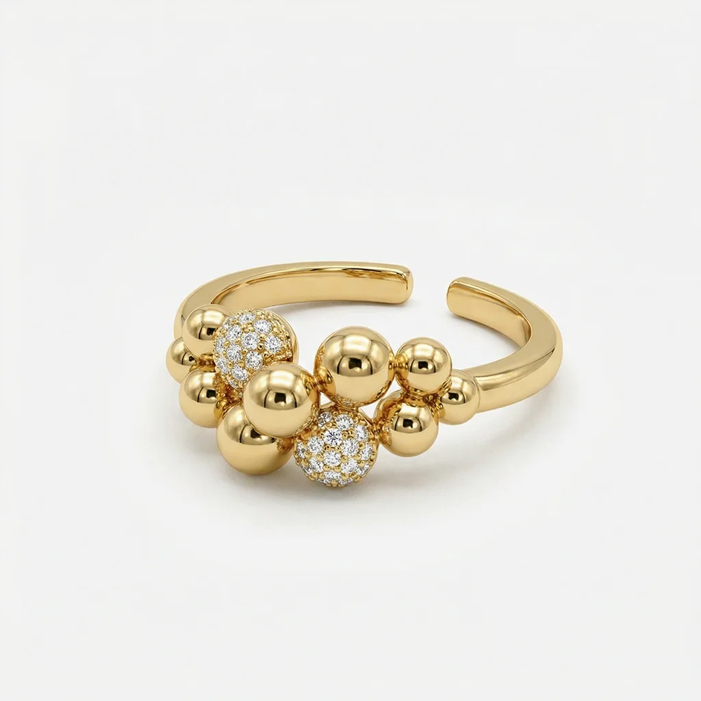 Denne nye ring er et markant og eksklusivt smykke, der kombinerer moderne design med elegant finesse. Ringens udtryk er skabt af bløde, afrundede former, hvor polerede guldfarvede kugler smelter sammen med funklende zirkonbesatte detaljer og danner et lev