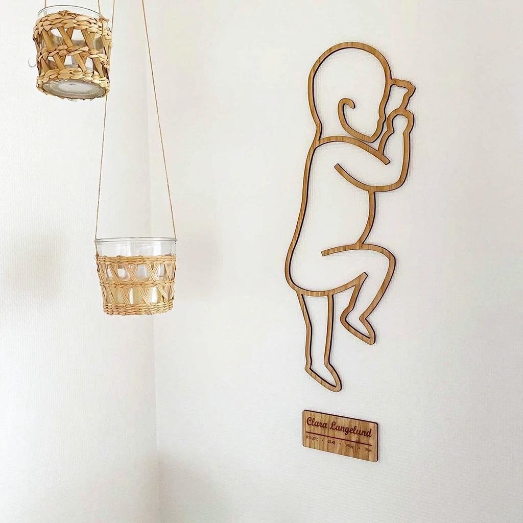 Birth Pose Fødselstavle i egetræ personlig vægdekoration Denne unikke fødselstavle er en smuk og personlig måde at forevige øjeblikket, hvor et nyt liv kommer til verden. Tavlen er udformet som en elegant træsilhuet af barnet i den klassiske fødselsposi