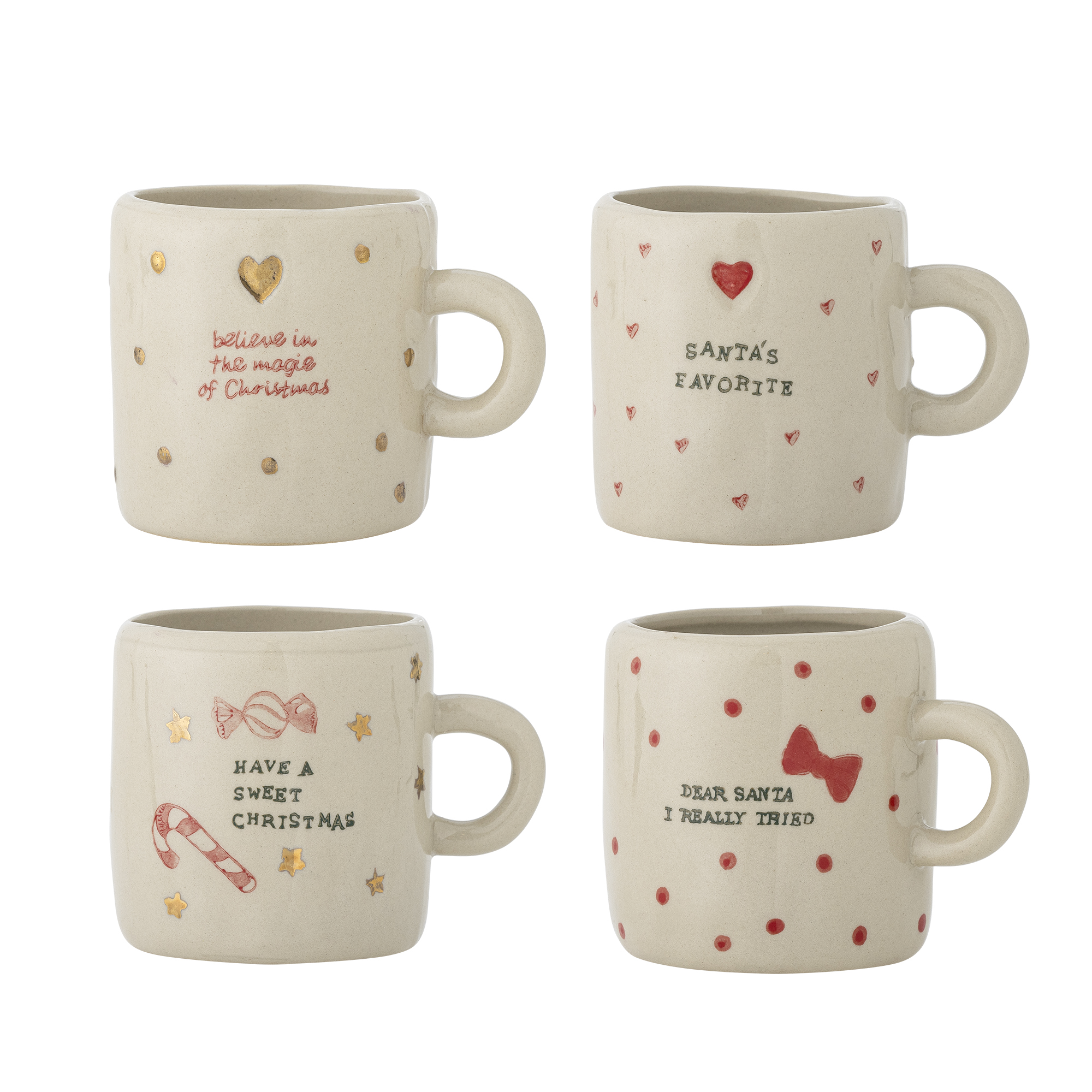 Christy Koppen fra Bloomingville er et sæt med 4 kopper i stentøj med håndmalet dekoration af festlige elementer i røde og gyldne toner. Der kan forekomme variationer i mønster og farvestyrke, så hver kop er helt unik.