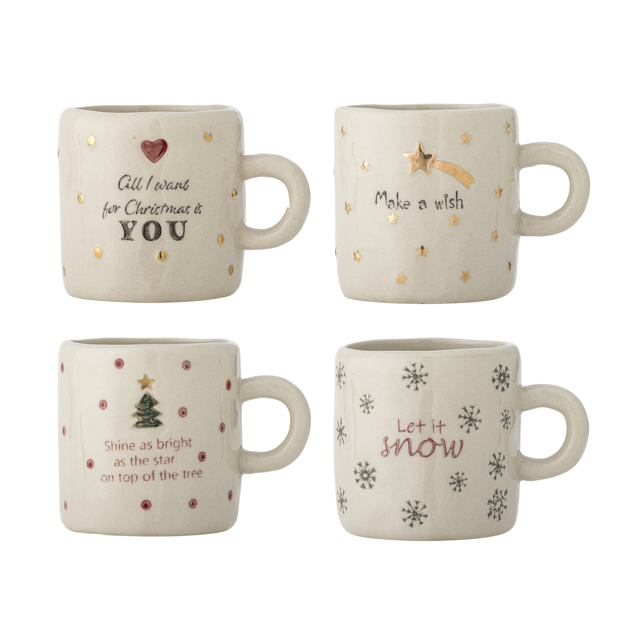 Christy Koppen fra Bloomingville er et sæt med fire kopper i stentøj i en blød beige nuance med et håndmalet udtryk og festlige motiver. Der kan forekomme variationer i mønster og farveintensitet, hvilket gør hver kop unik.
