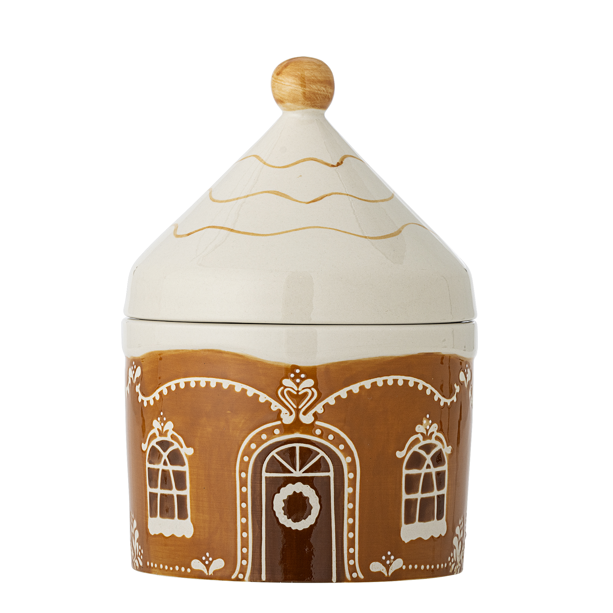 Gina Krukken m/låg fra Bloomingville er en dekorativ stentøjskrukke formet som et hus med håndmalede, reliefprægede detaljer. Der medfølger en silikoneforsegling, der sikrer en tæt lukning. Der kan forekomme variationer i mønster og farveintensitet, hvilk