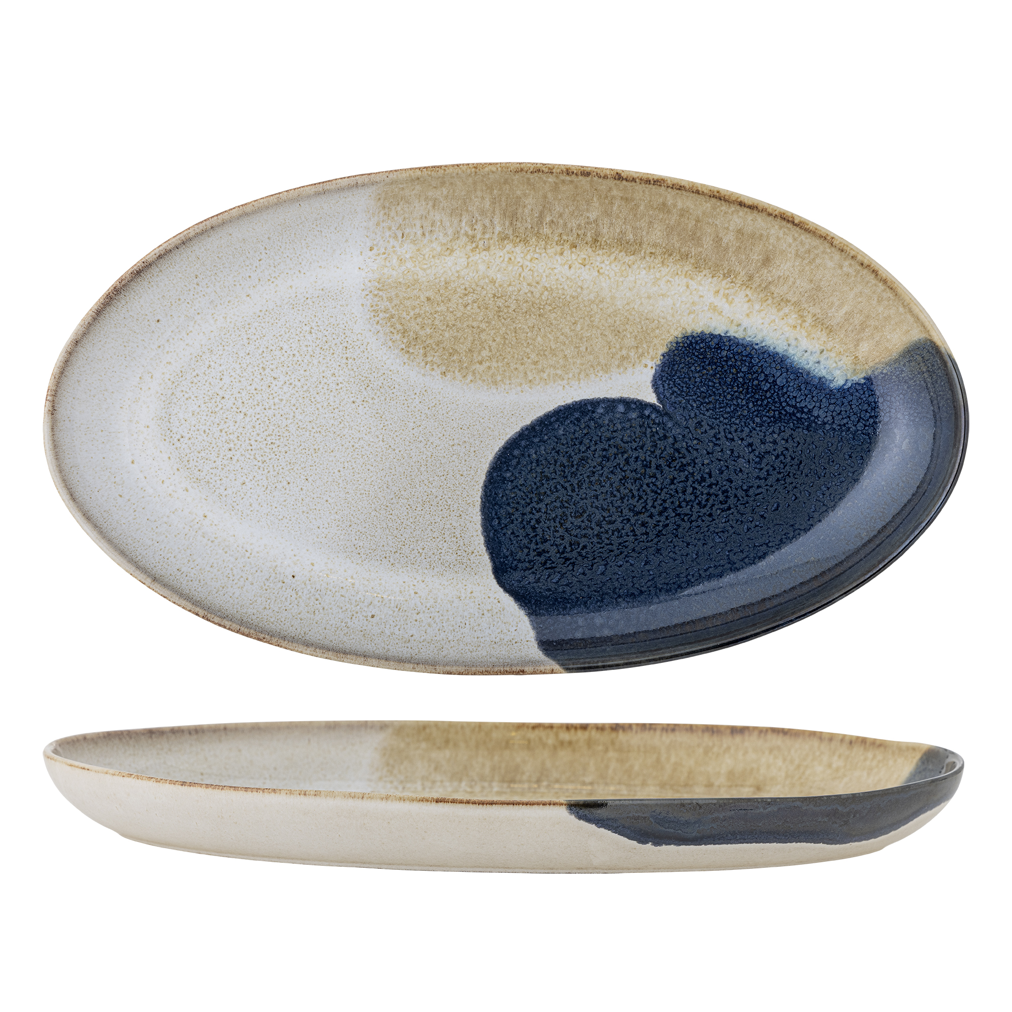 Jules Serveringsfadet fra Bloomingville er fremstillet i stentøj med en reaktiv glasur, der giver en levende og nuanceret overflade. Den beige bund prydes af pensellignende blå detaljer og en mat, let spættet finish, og formen er en anelse ujævn. Små vari