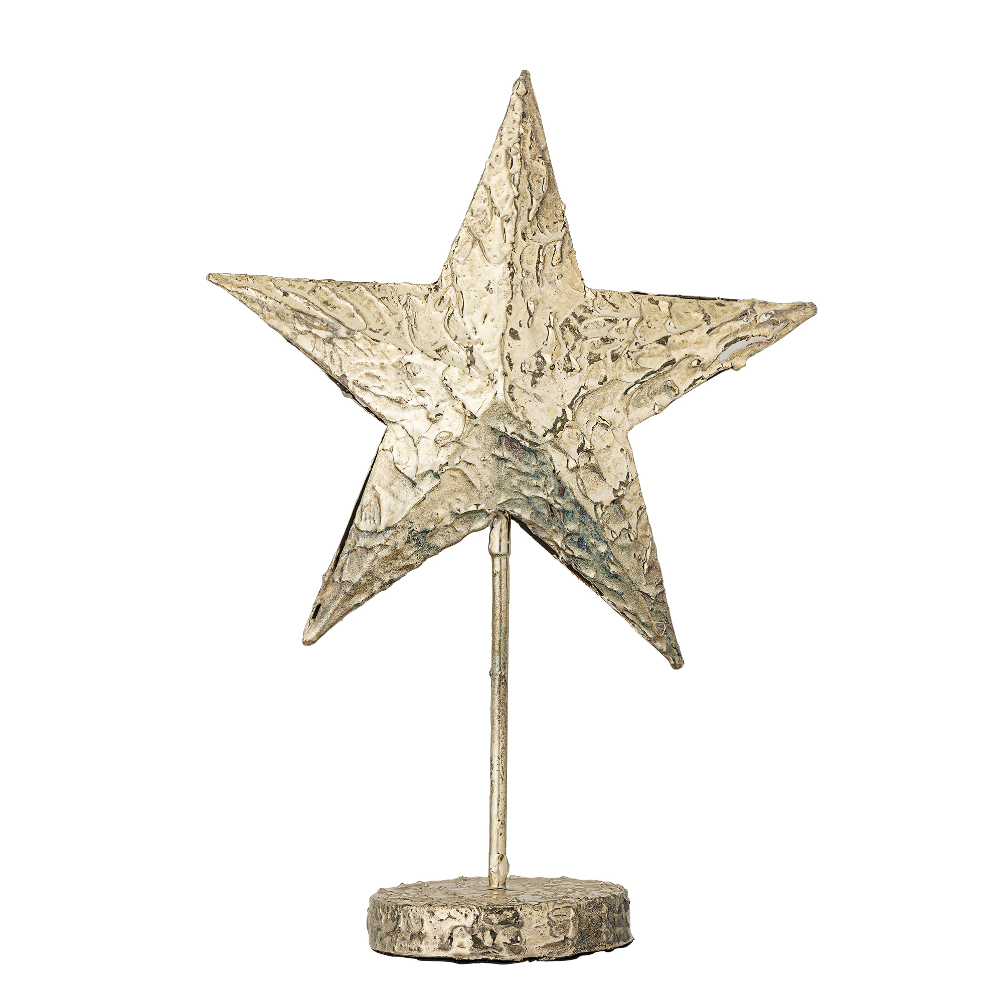 Nilos Dekoen fra Bloomingville er en festlig stjernefigur med skulpturel form og hamret overflade. Den står på en slank stang med rund fod og har en varm gylden finish.