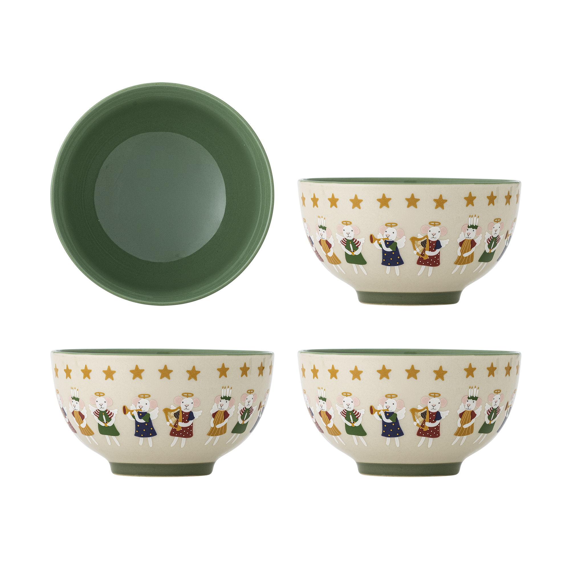 Peo Skålen fra Bloomingville er et sæt med fire skåle i stentøj med et legende motiv af mus og gyldne stjerner. Den bløde beige yderside står i flot kontrast til den dybgrønne inderside og bund. Et festligt design med karakterfulde detaljer.