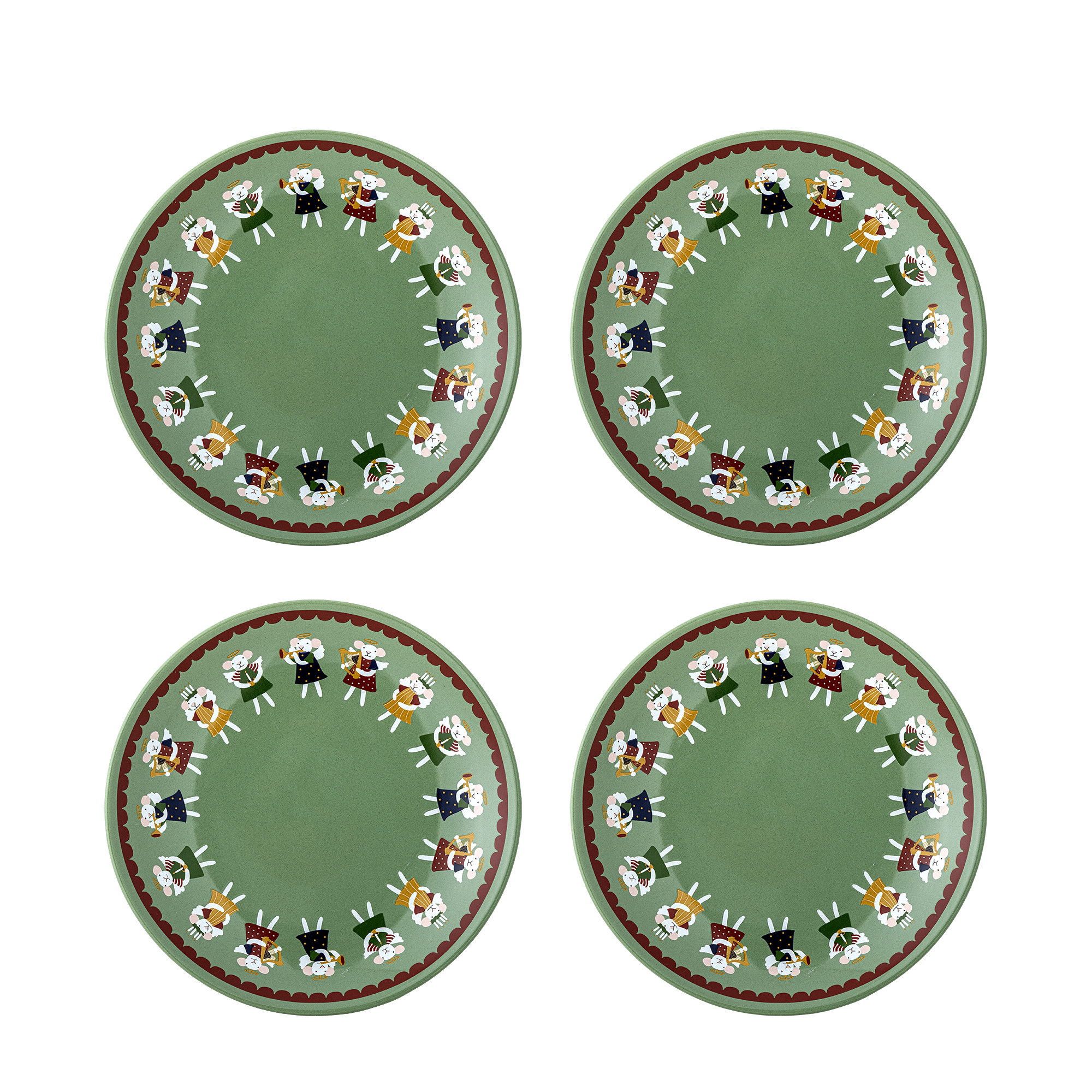Peo Tallerkenen fra Bloomingville er et sæt med fire runde tallerkener i grønt stentøj. Hver tallerken har et dekorativt tryk med et gentaget motiv af små mus.