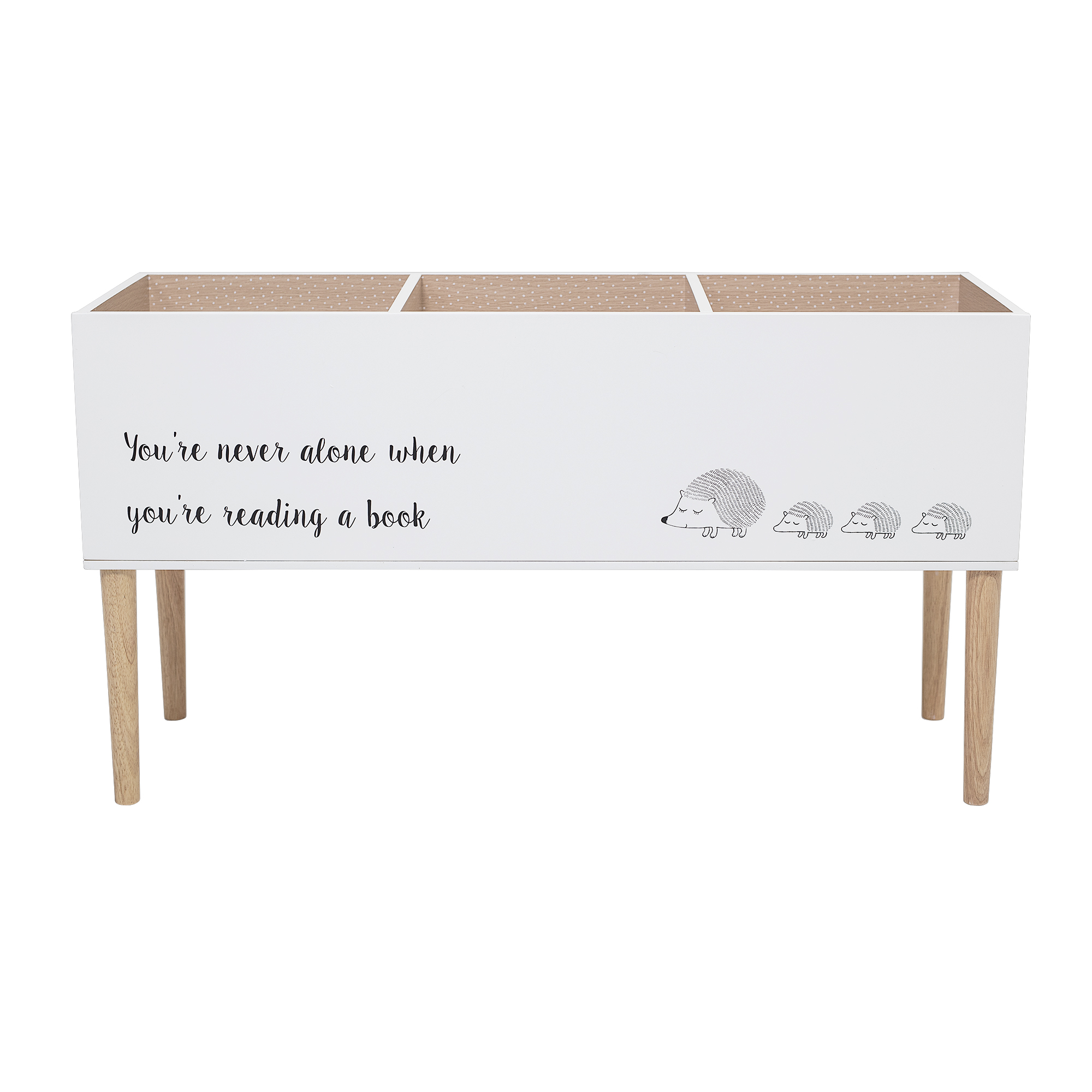 Salam Bogkassen fra Bloomingville MINI er en sød opbevaringsløsning i hvidt MDF med ben i lyst træ. Den har tre rummelige sektioner, perfekt til bøger og småting. På fronten ses et fint pindsvinemotiv og teksten Youre never alone when youre reading a book