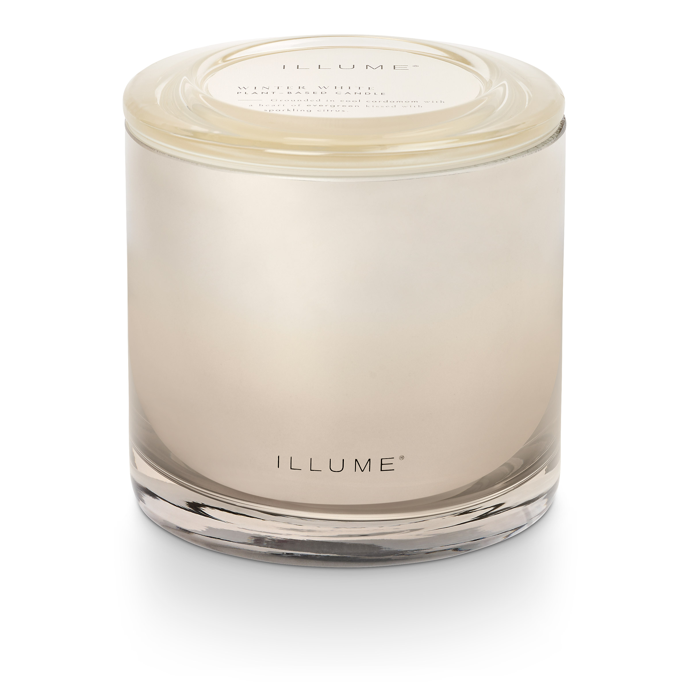 Winter White Statement Glass Duftlys fra ILLUME. Med duftnoter af kølig kardemomme, stedsegrønt og et strejf af citrus. Omhyggeligt designet fra voks til væge, så du kan placere lysene hvor som helst i hjemmet eller på kontoret. Glasbeholderen har et smu