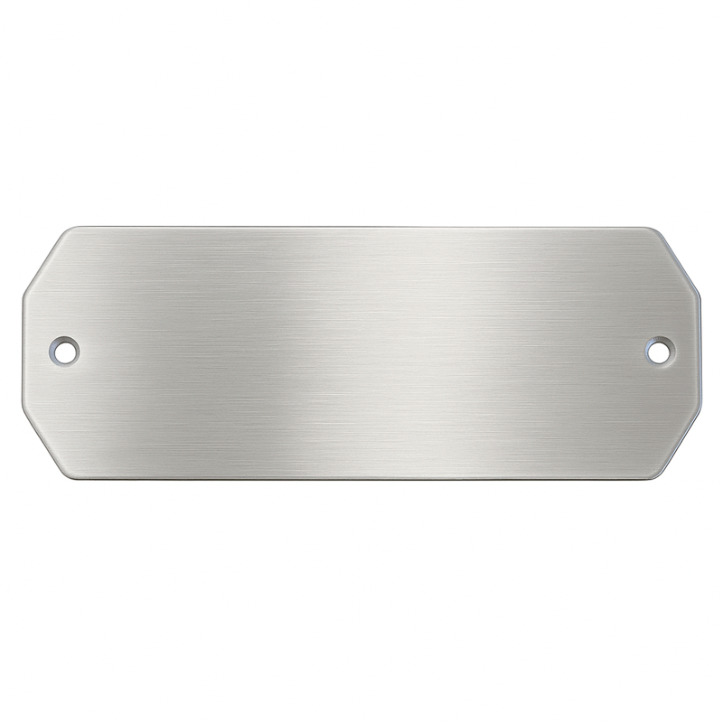 Rustfri stålskilt 2 hullerEt elegant og enkelt metalskilt i børstet rustfrit stål. Skiltet har afrundede hjørner og to forborede huller til nem montering. Perfekt til gravering af navn, titel eller anden information. Ca. mål: 17 x 5,5 cm Fremstillet i ru