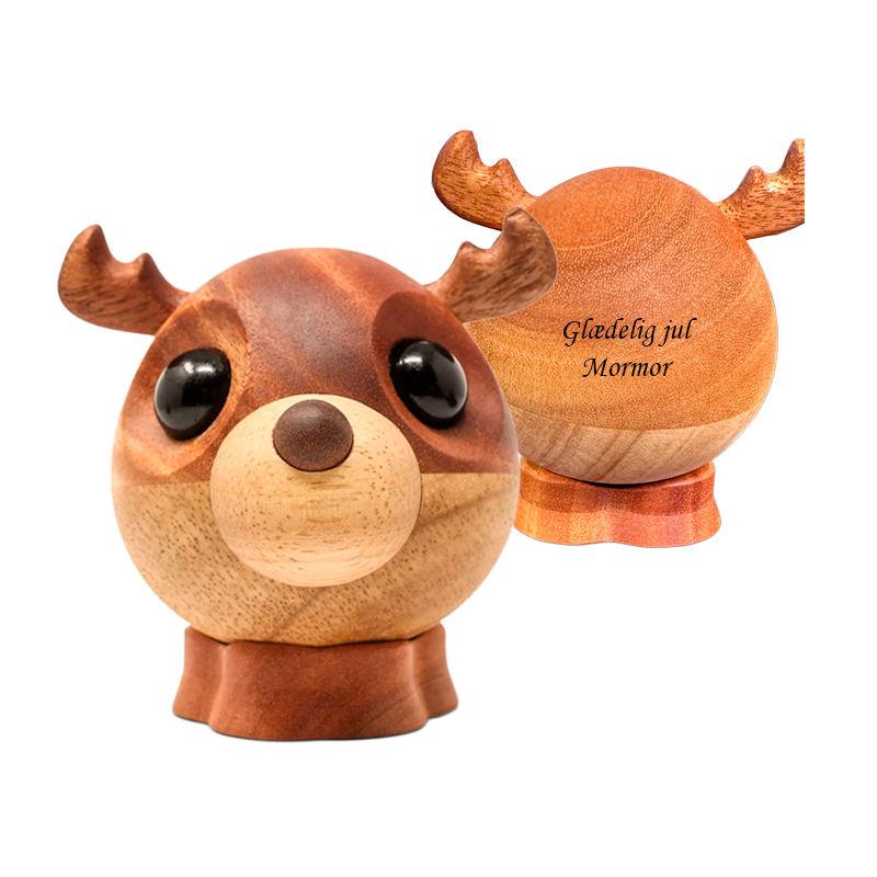 Charmerende rensdyr der spreder julestemning Fremstillet i vietnamesisk mahogni og gummitræ Smuk holdbar figur med varmt trælook Mulighed for personlig gravering bagpå op til 3 linjer Mål H 10 cm L 7 cm B 10 cm Vægt 150 g CE godkendt Rolf det store jule-