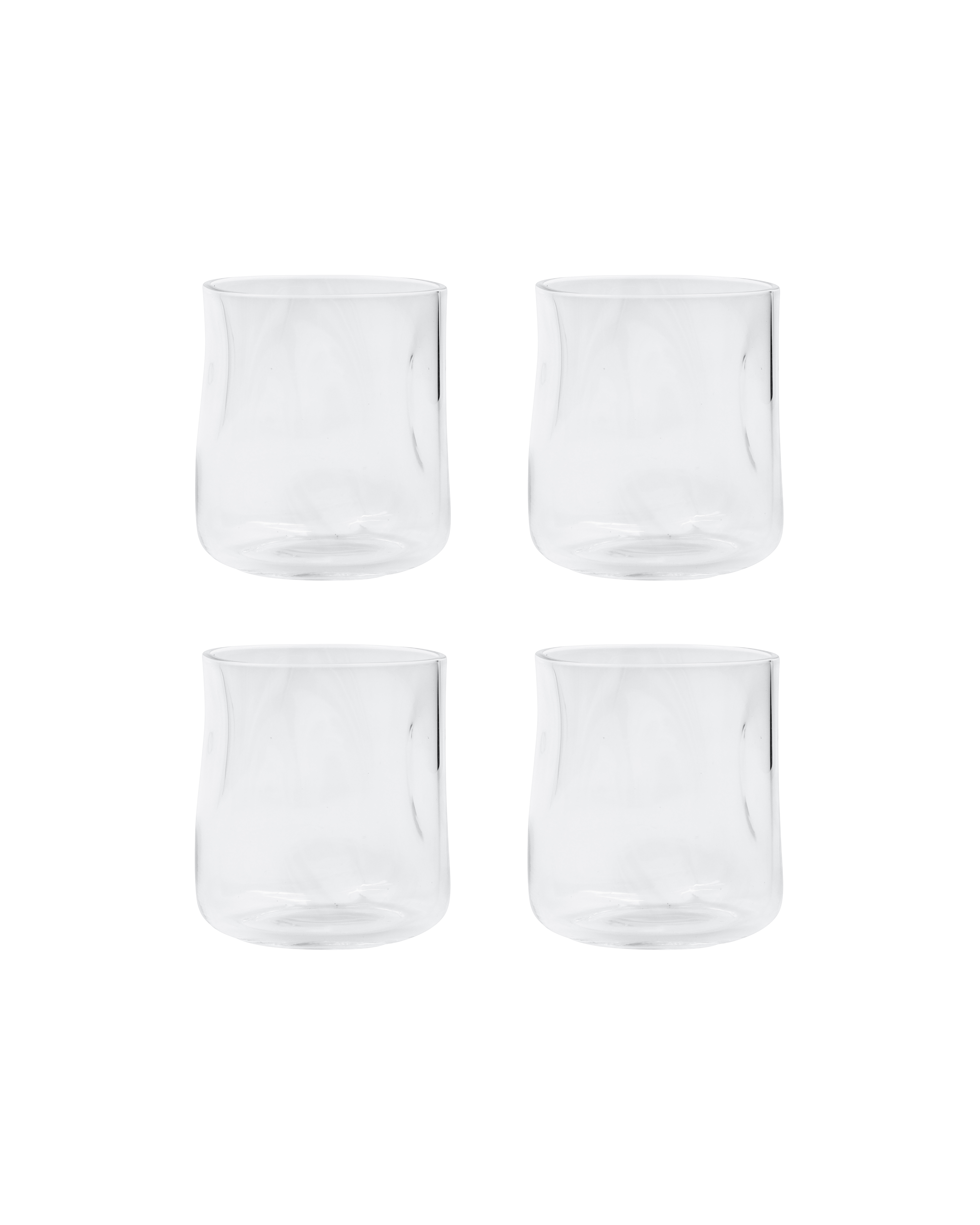 Dette sæt består af fire klare glas med en organisk form, der ligger godt i hånden. Glassene er fremstillet af presset, mundblæst glas.- Sæt med 4 stk.- Sofistikeret organisk form.- Mundblæst glas.- Moderne design.- Kan gå i opvaskemaskinen