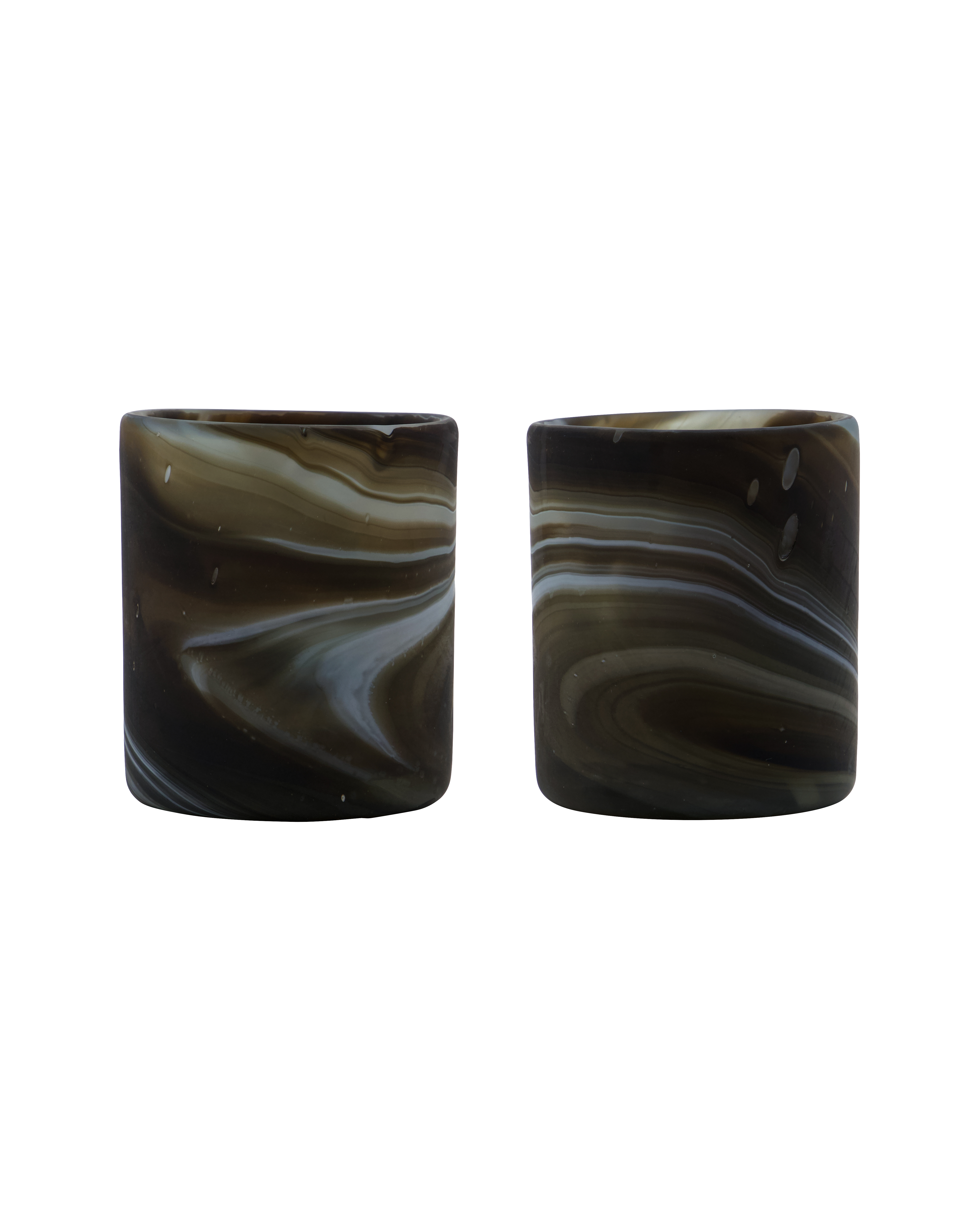 Skab stemning med dette sæt med to fyrfadsstager i mundblæst, brunt glas. Det marmorerede mønster kaster et varmt, levende lys og giver både elegance og liv til stue, spiseplads eller badeværelse.- Sæt med 2 stk.- Mundblæst glas.- Marmoreret brunt mønster