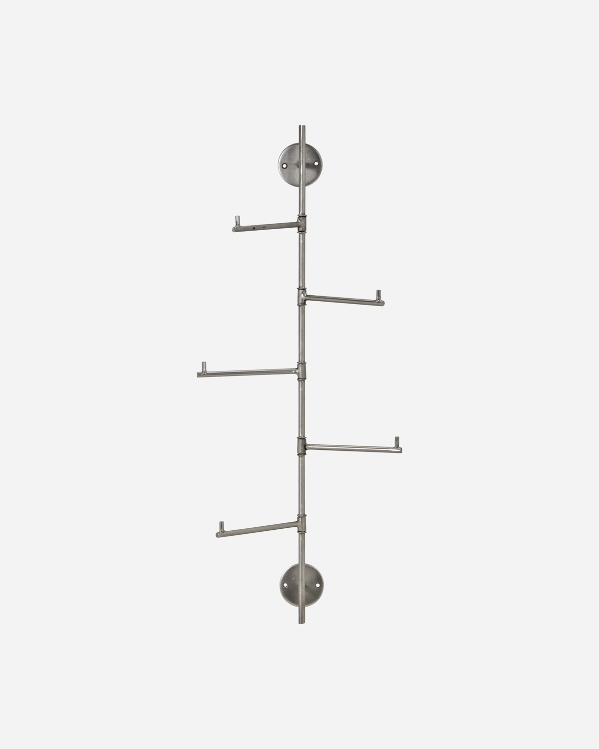 Håndlavet knagerække med elegant sølvfinish giver et skulpturelt udtryk i din entré eller garderobe. De fem kroge kan drejes og tilpasses til din hverdag både smukt og praktisk i ét. - Fem drejelige kroge - Elegant sølvfinish - Håndlavet design - Robust