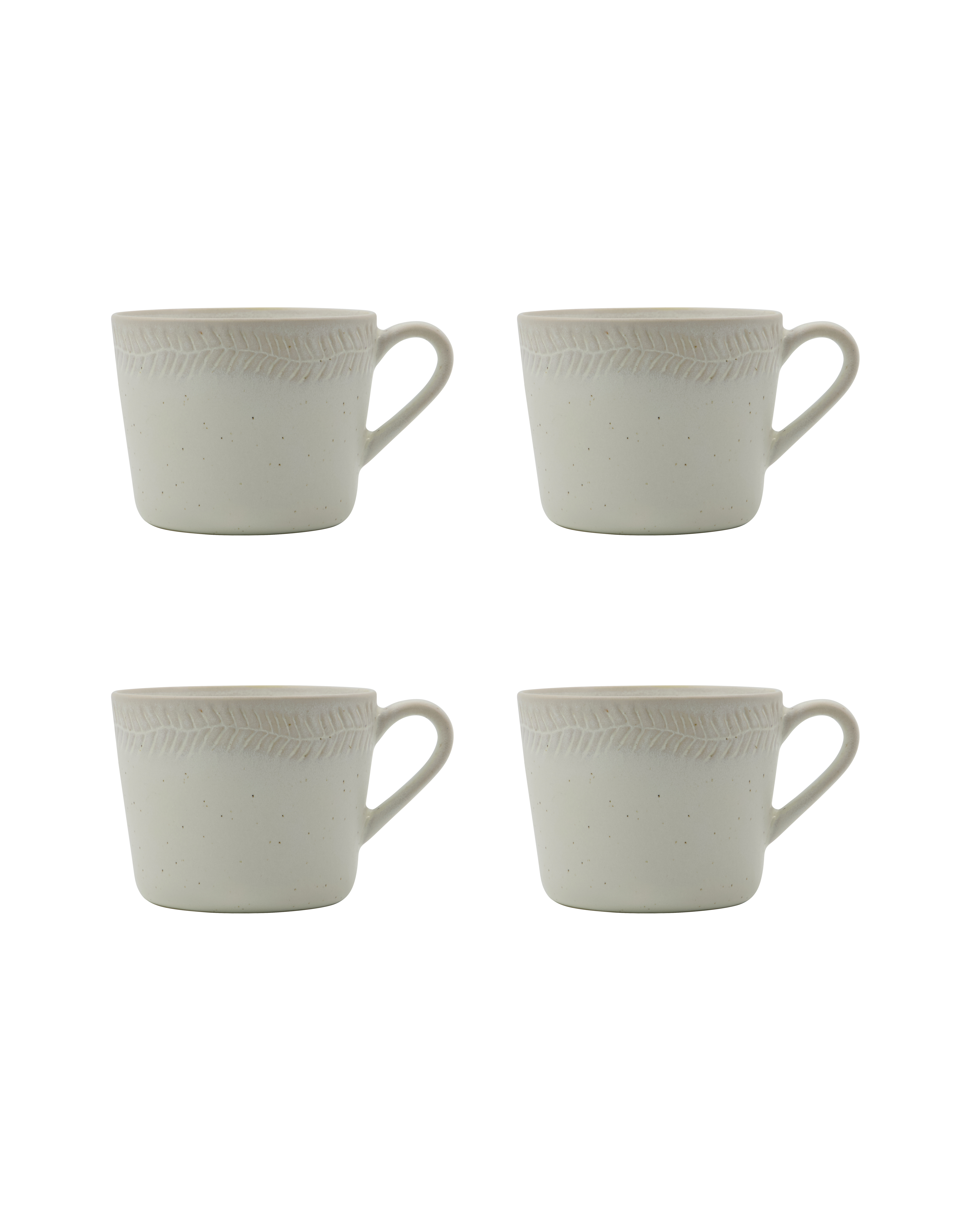 Disse krus er fremstillet af stentøj med en off-white plettet glasur og et diskret mønster. De har en glat overflade og en klassisk silhuet. Det robuste design gør dem velegnede til daglig brug og nemme at kombinere med andet service. Leveres i et sæt med
