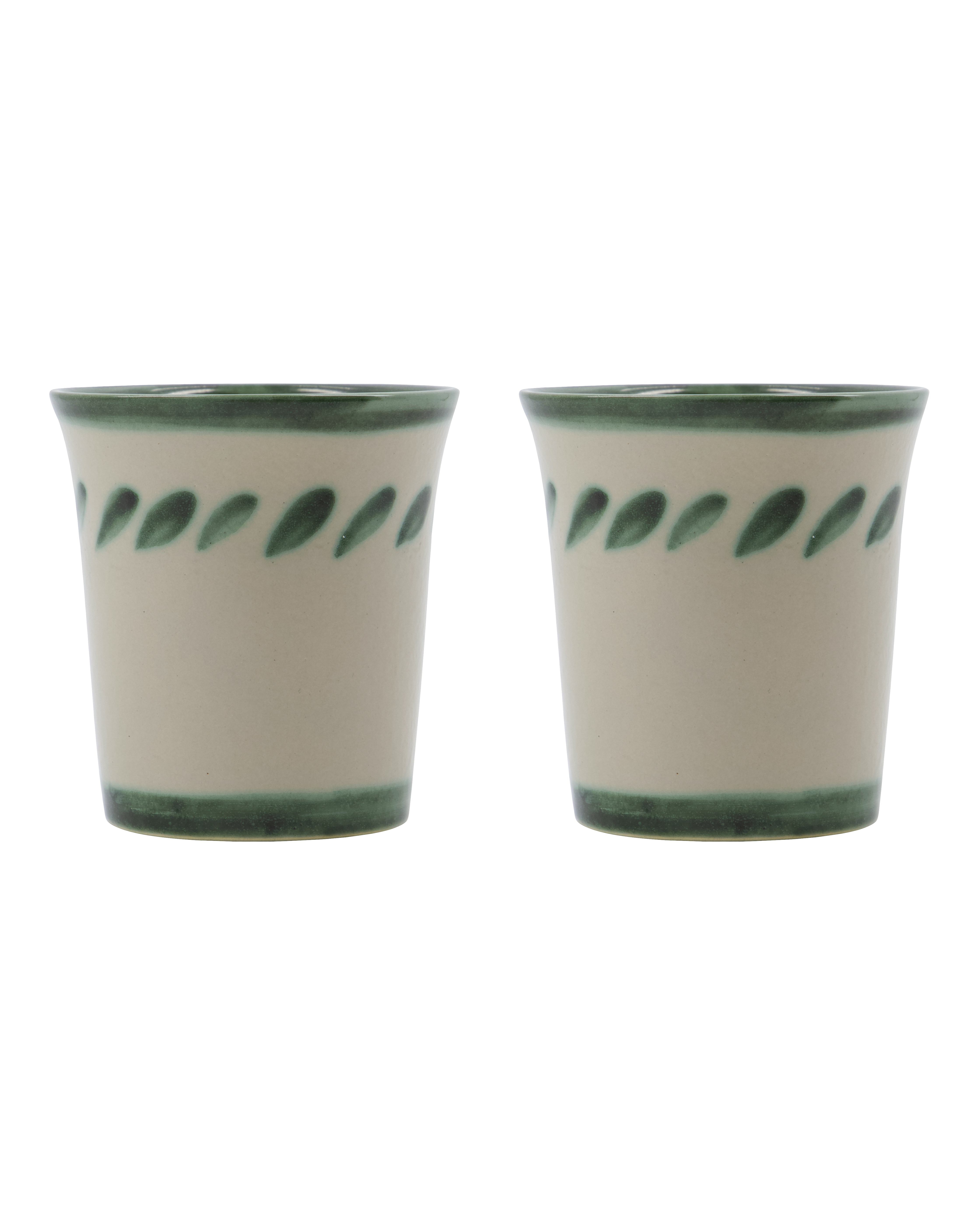 Et sæt kopper i stentøj med nostalgisk, håndmalet grønt mønster skaber hyggestemning, når du serverer kaffe, te eller varm kakao. Den let koniske form ligger behageligt i hånden og gør hver kop unik. Perfekt til hverdagens rolige stunder eller som farveri