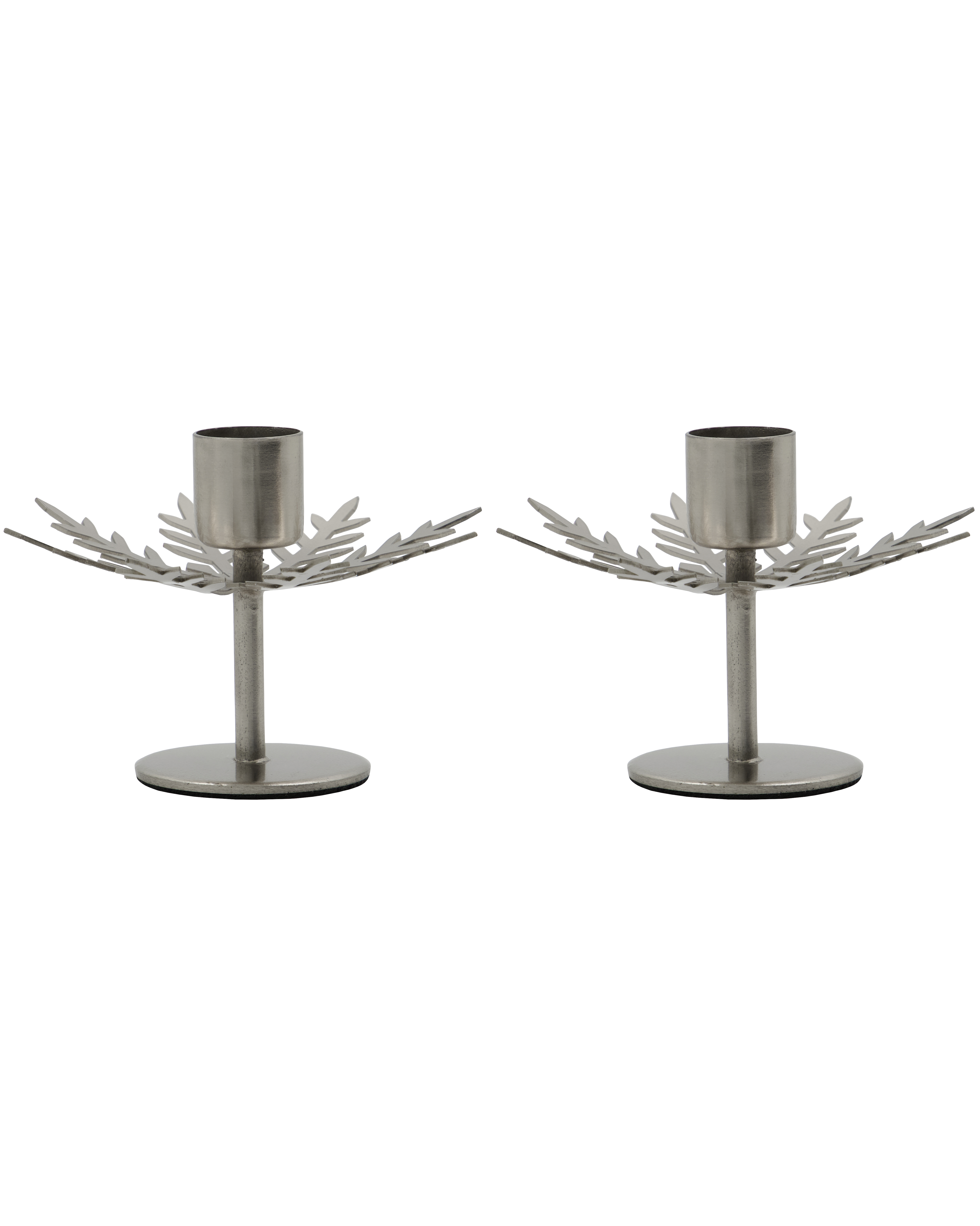 Disse lysestager er fremstillet af jern med sølvfinish og har et snefnuginspireret design med fine detaljer. Designet til at passe til standard koniske stearinlys.Sæt med 2 stk.HåndlavetSølvfinishPasser til standard koniske stearinlys
