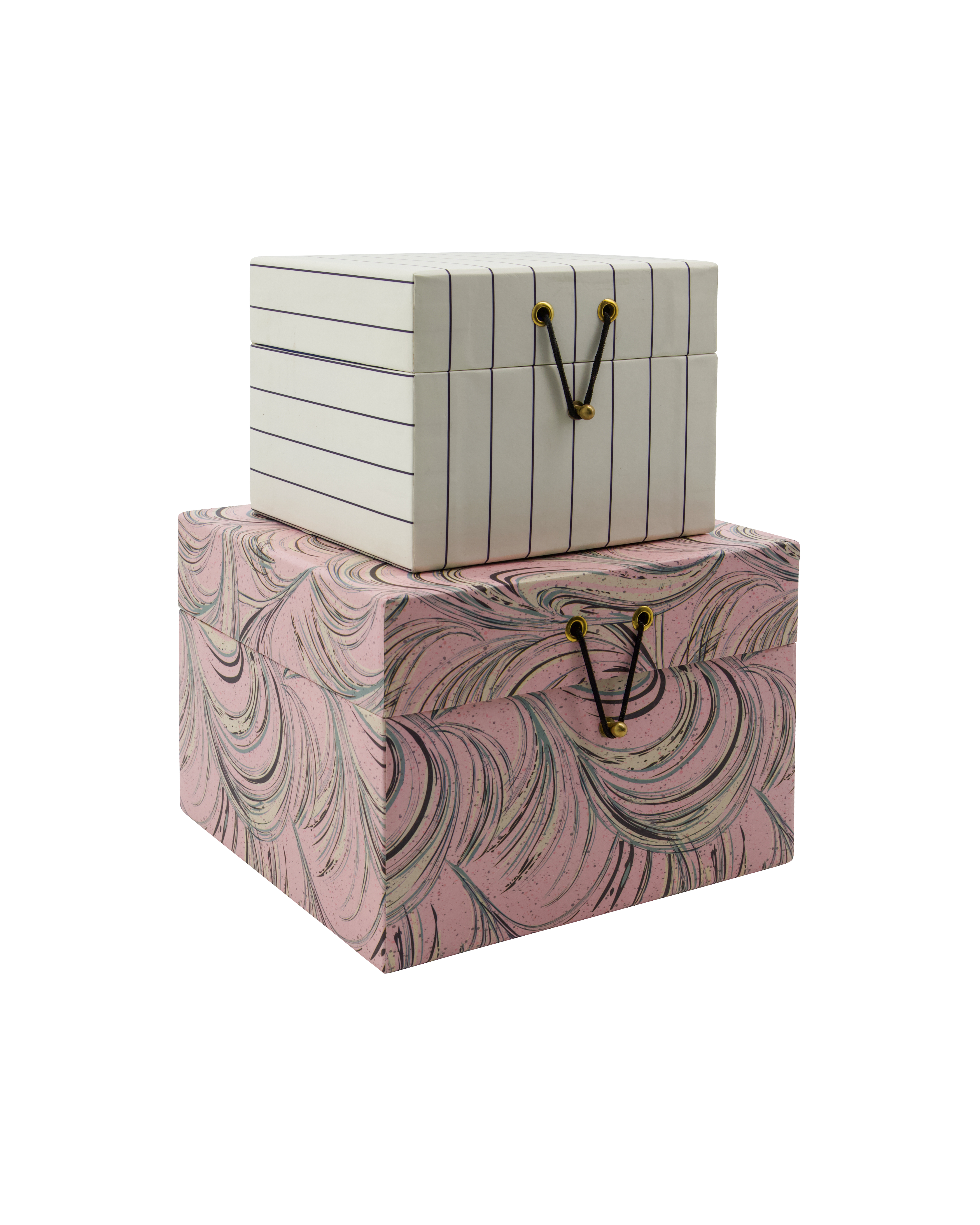 Sæt af to opbevaringskasser i sand og en afdæmpet rosa. Perfekt til at organisere kontorartikler, dokumenter og småting.- Sæt med 2 stk..- Sandfarvet mønster med blå striber og klar blå inderside.- Pink marmormønster og dueblå inderside.- Håndlavet.- Deko