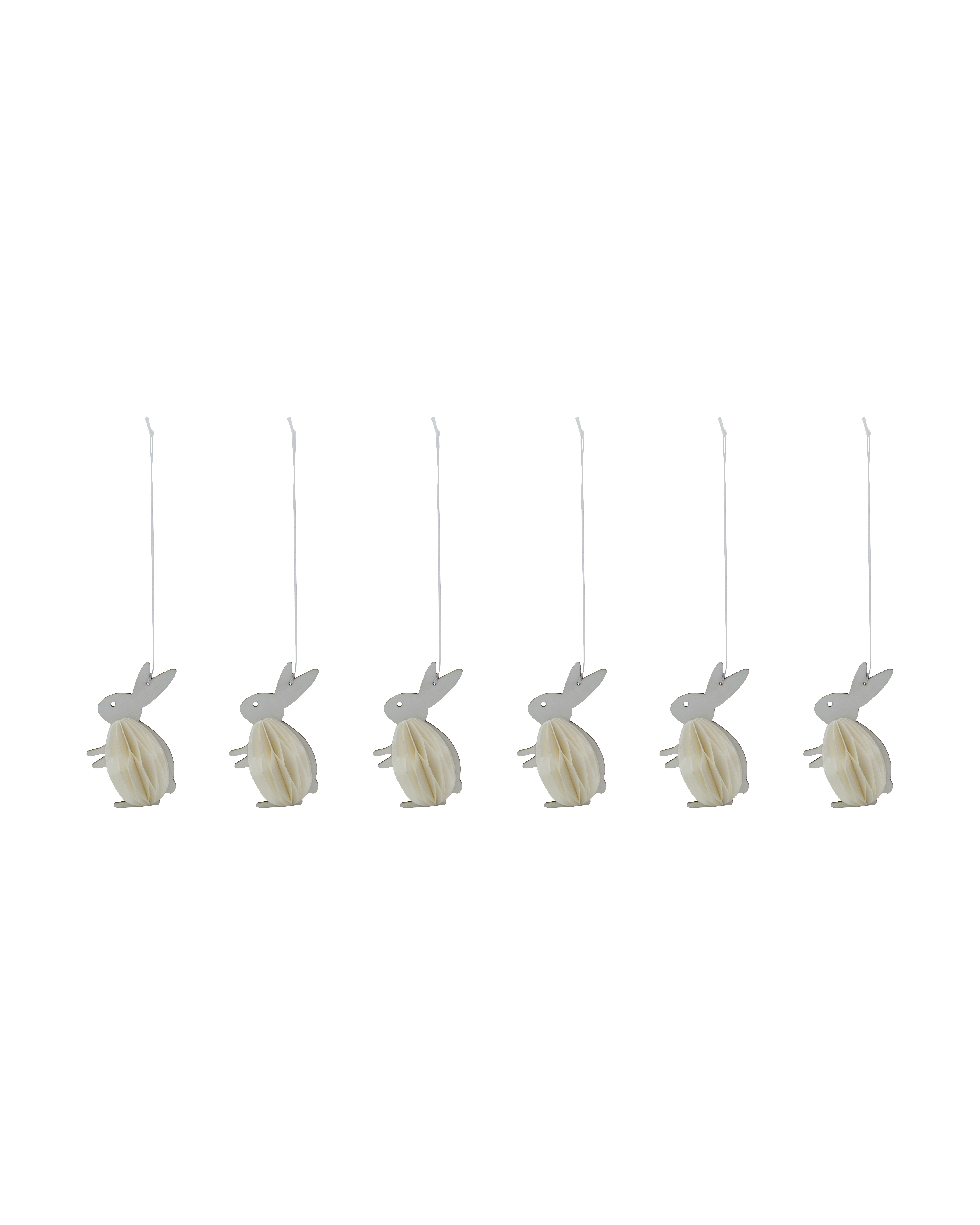 Set of six rabbit-shaped paper ornaments in off-white. Each piece features a fold-out design and hanging loop. Lightweight and easy to hang.- Set of six.- Paper honeycomb design.- Off-white colour.- For hanging.