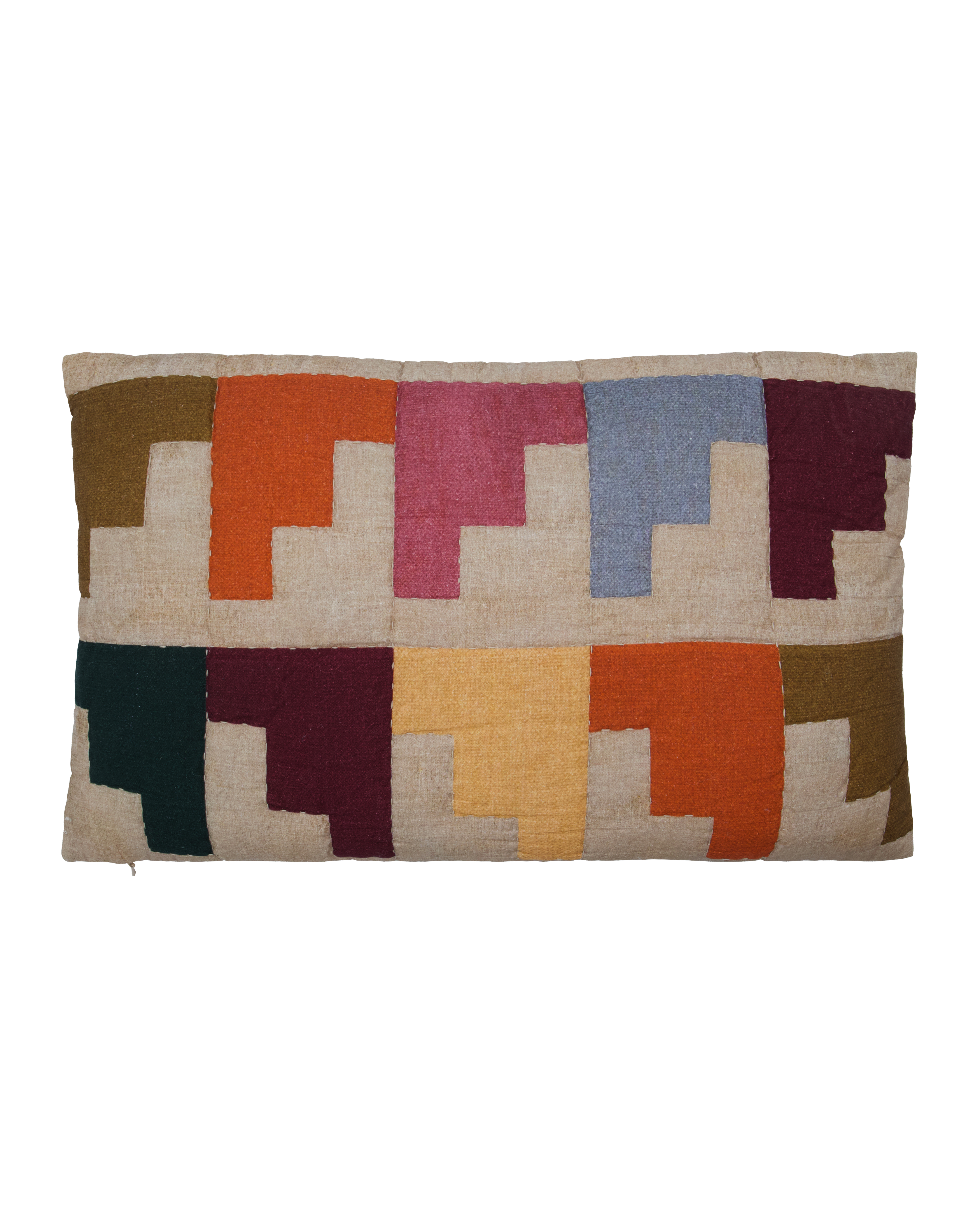 Et håndtrykt, grafisk mønster i levende farver gør dette pudebetræk til et blikfang i stue, soveværelse eller læsehjørne. De fine broderede detaljer på den bløde bomuld giver karakter og personlighed, mens den multifarvede palet skaber varme og stemning i