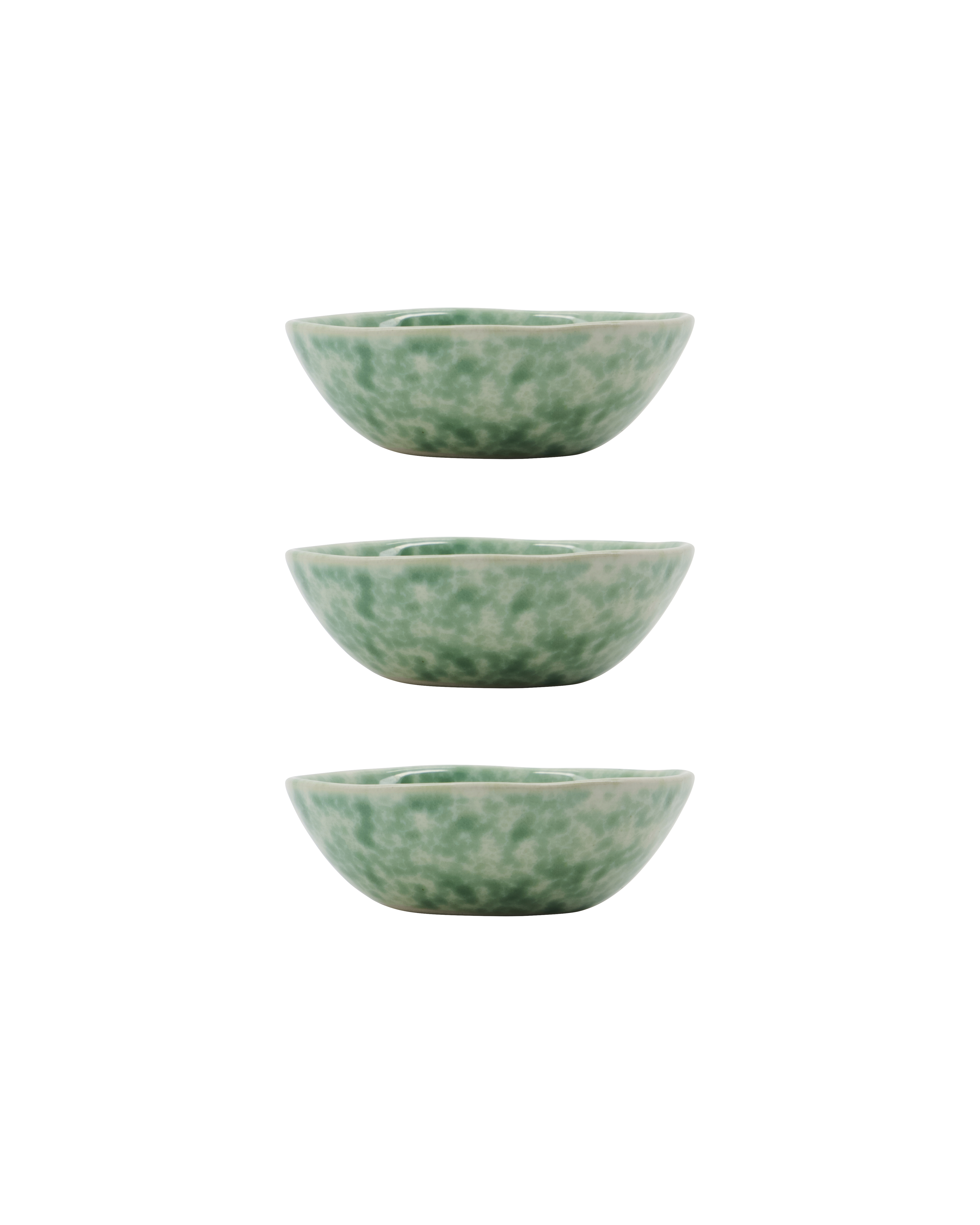 Tilføj et frisk pust til din borddækning med dette sæt med 3 håndlavede skåle i stentøj. De ujævne former og håndmalede grønne stænkmønstre giver et moderne, hyggeligt look, der gør hvert sæt unikt. Brug dem til morgenmad, snacks eller små serveringer el