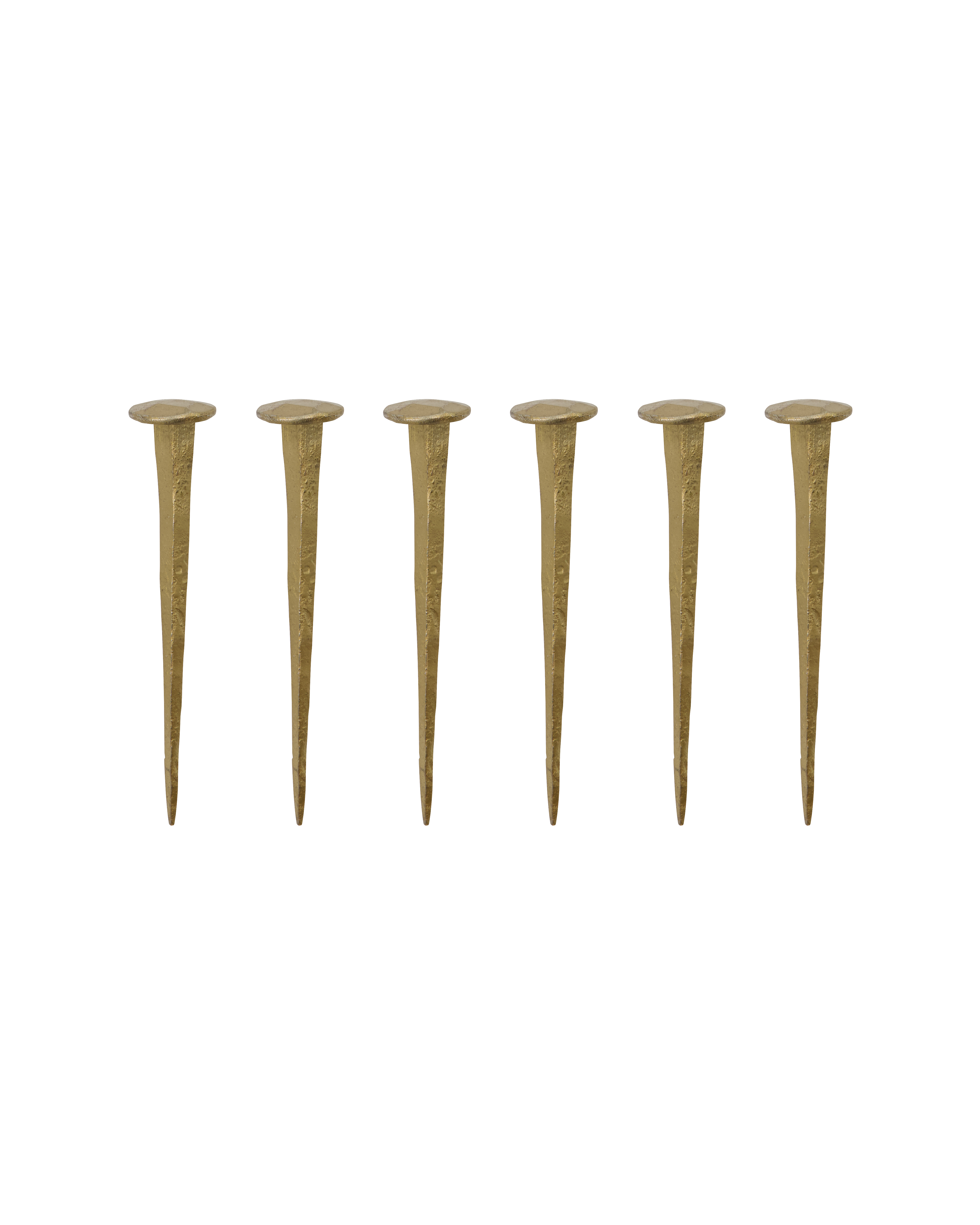Et sæt fyldige, sømformede kroge giver et råt og personligt udtryk i din entré, i dit køkken eller på dit badeværelse. Den håndlavede form og messingfinish giver varme, mens det ujævne look skaber en uformel charme.- Sæt med 6 kroge.- Håndlavet, unik over