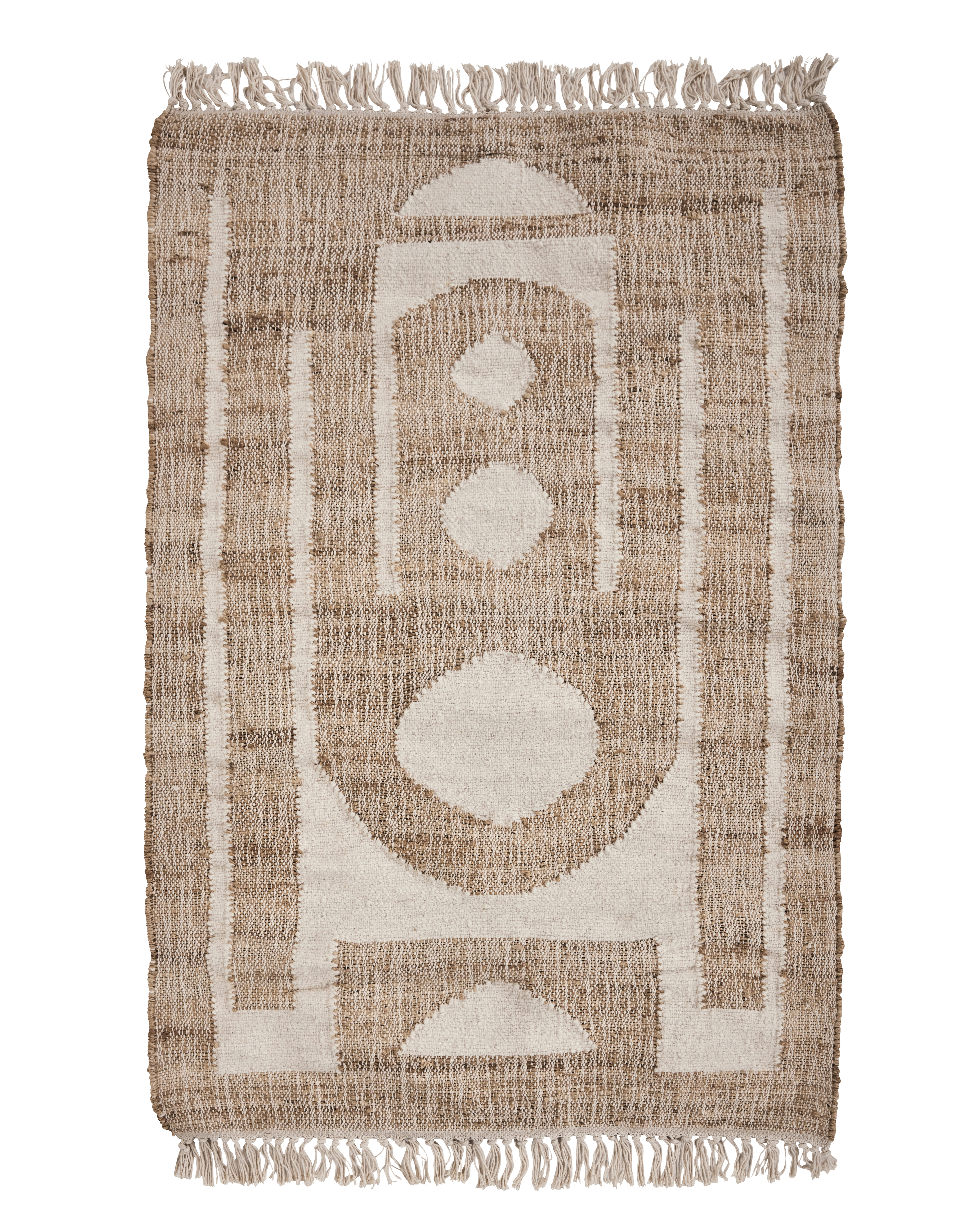 Dette tæppe er håndlavet til perfektion og giver varme og stil til din bolig. Det er lavet af en blanding af uld, jute og bomuld og har en naturlig nuance med et moderne off-white grafisk mønster. Det indviklede design og de frynsede kanter gør det til et
