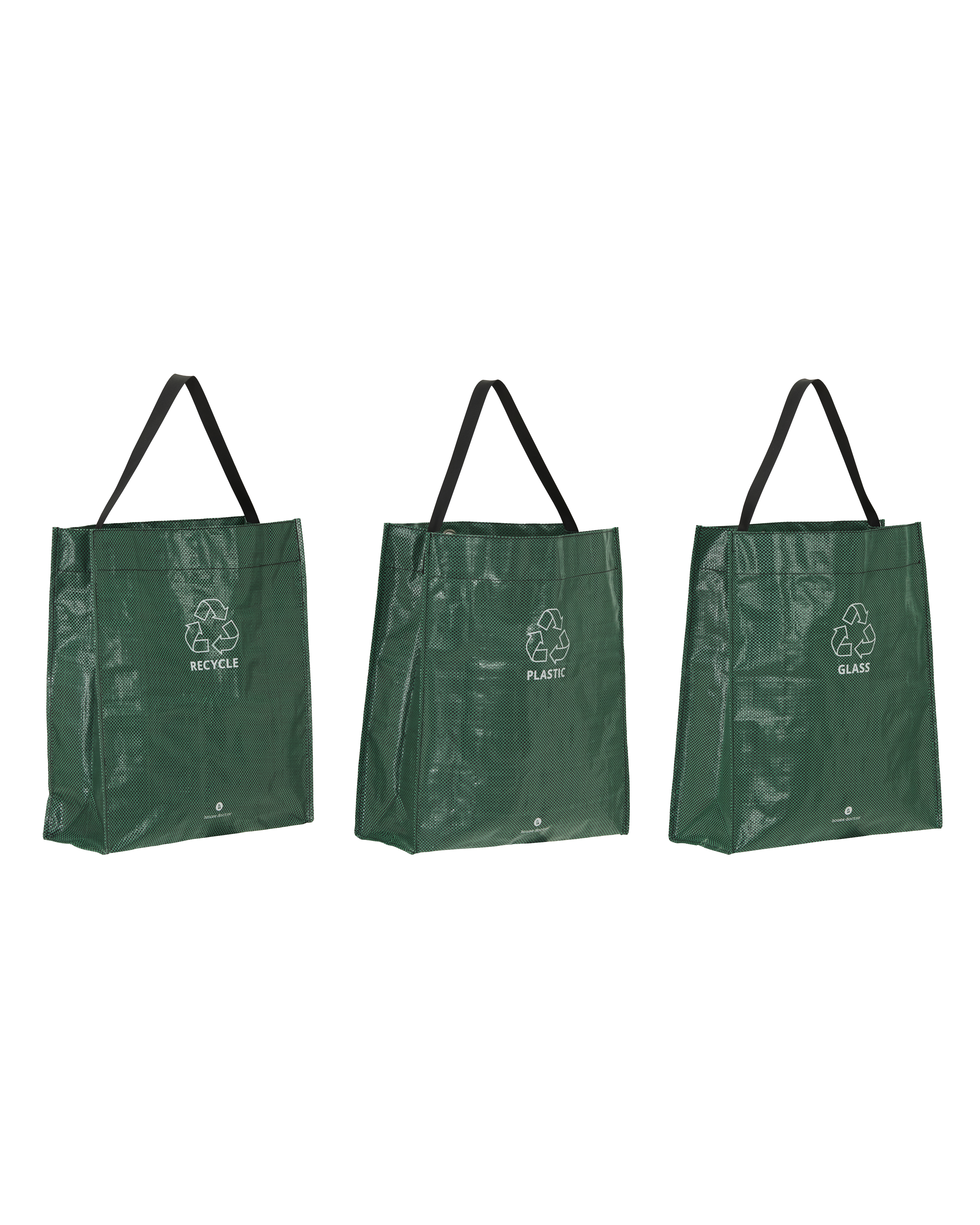 HDRecycle-sættet gør affaldssortering til en nem og overskuelig del af hverdagen. Sættet indeholder tre grønne poser med et praktisk design.- Sæt med 3 stk.- Praktisk PP-overflade, nem at rengøre.- Ternet mønster i grøn og sort.- Nem at bære.