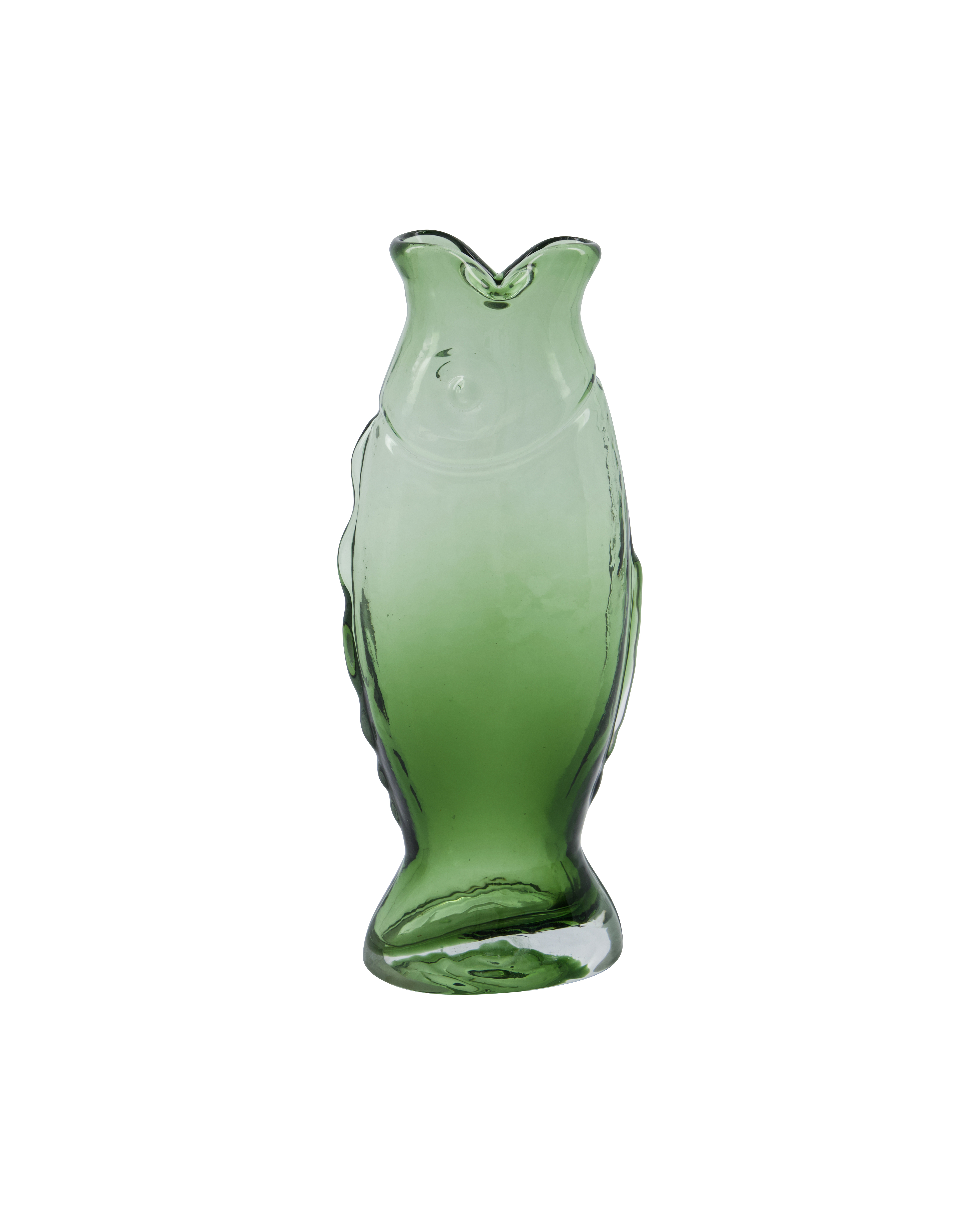 Denne unikke grønne vase er skabt i mundblæst glas og formet som en fisk, hvilket tilføjer et kunstnerisk og livligt præg til din boligindretning. Med sine glatte kurver og subtile detaljer skaber den en følelse af personlighed og glæde i ethvert rum. -