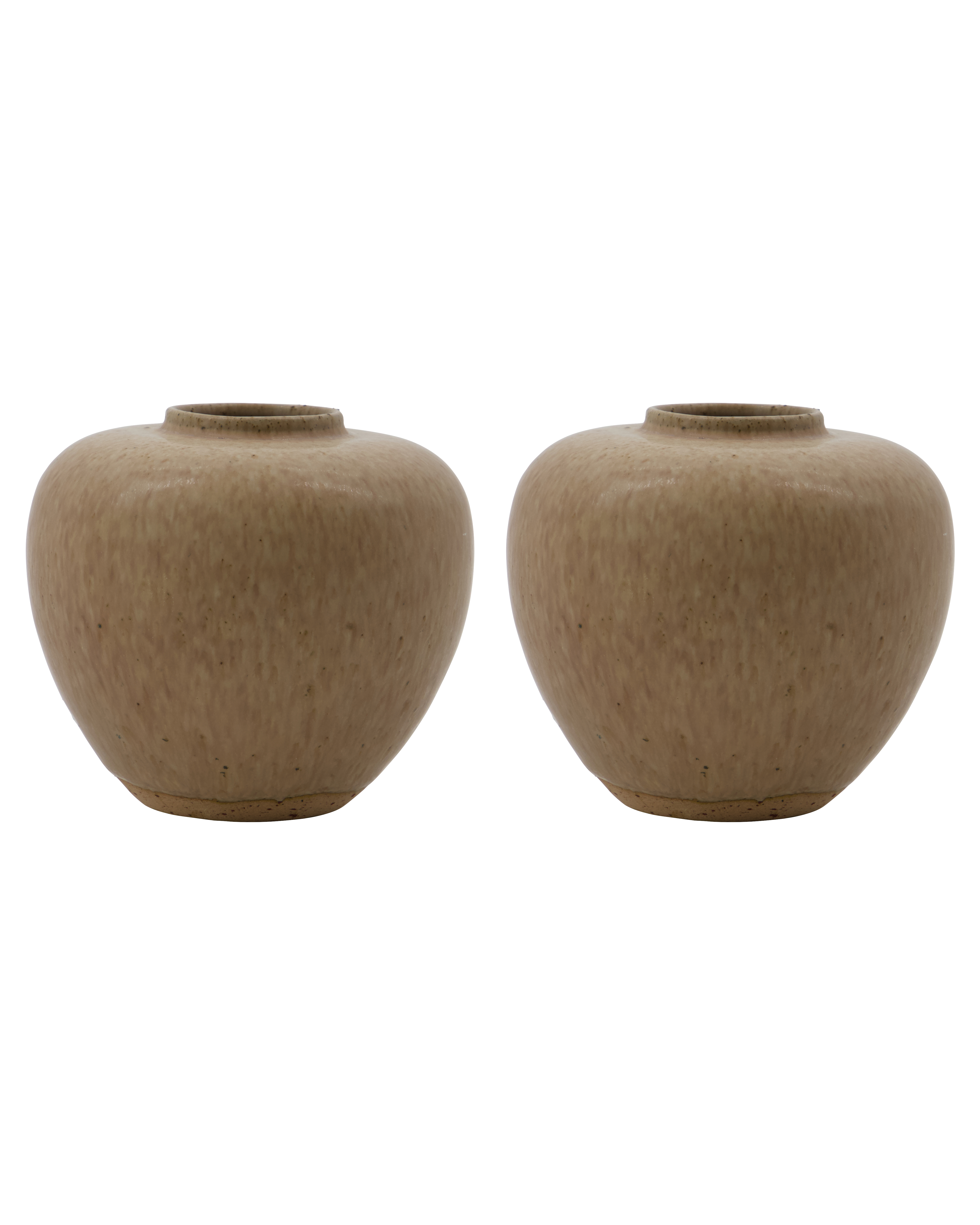Et sæt med to vaser lavet i stentøj med en spættet, grå glasur. Med deres voluminøse, afrundede former og matte overflade giver dette sæt med to vaser et roligt og taktilt udtryk til hjemmet.- Sæt med 2 stk.- Lertøj.- Mat, spættet grå glasur.- Håndlavet.