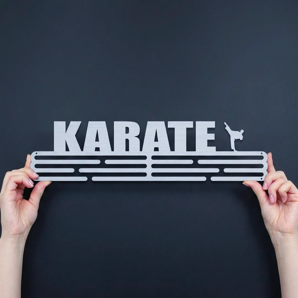 Medaljeophæng Karate i børstet stål Dette stilrene medaljeophæng med teksten KARATE og en dynamisk kampsportsfigur er skabt til karateudøvere, der ønsker at fremvise deres medaljer på en flot og inspirerende måde. Designet afspejler styrke, disciplin og d