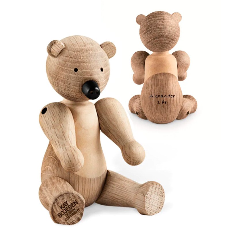 Bjørn 14,5 cm Ubehandlet eg, ubehandlet ahorn FSC®-CERTIFICERET Kay Bojesen Design Gratis gravering Kay Bojesen lille bjørn i egetræ passer perfekt i ethvert hjem. Den lille bjørn måler 14,5 cm og kan bevæge både arm og ben. Bjørnene kan lasergraveres