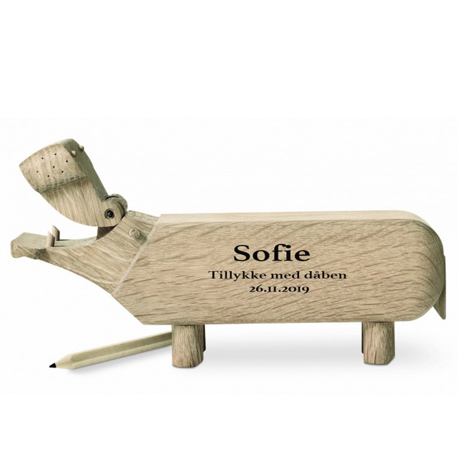 Flodhest Ubehandlet eg FSC®-CERTIFICERET Kay Bojesen Design Gratis gravering Kay Bojesen flodhest 21,5 x 9 cm. Flodhesten blev født i 1955 som et muntert indslag til at holde styr på blyanten på skrivebordet. Flodhesten kan lasergraveres med egen tekst p