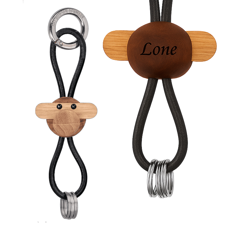 Ikonisk Kay Bojesen-abe i FSC®-certificeret træ Hoved i olieret teak og limba Naturfarvet lædersnor kan justeres Sølv nøglering med karabinhage Originalt dansk design siden 1922 Tag Kay Bojesens elskede klassikere med dig overalt på tasken, i bæltet ell