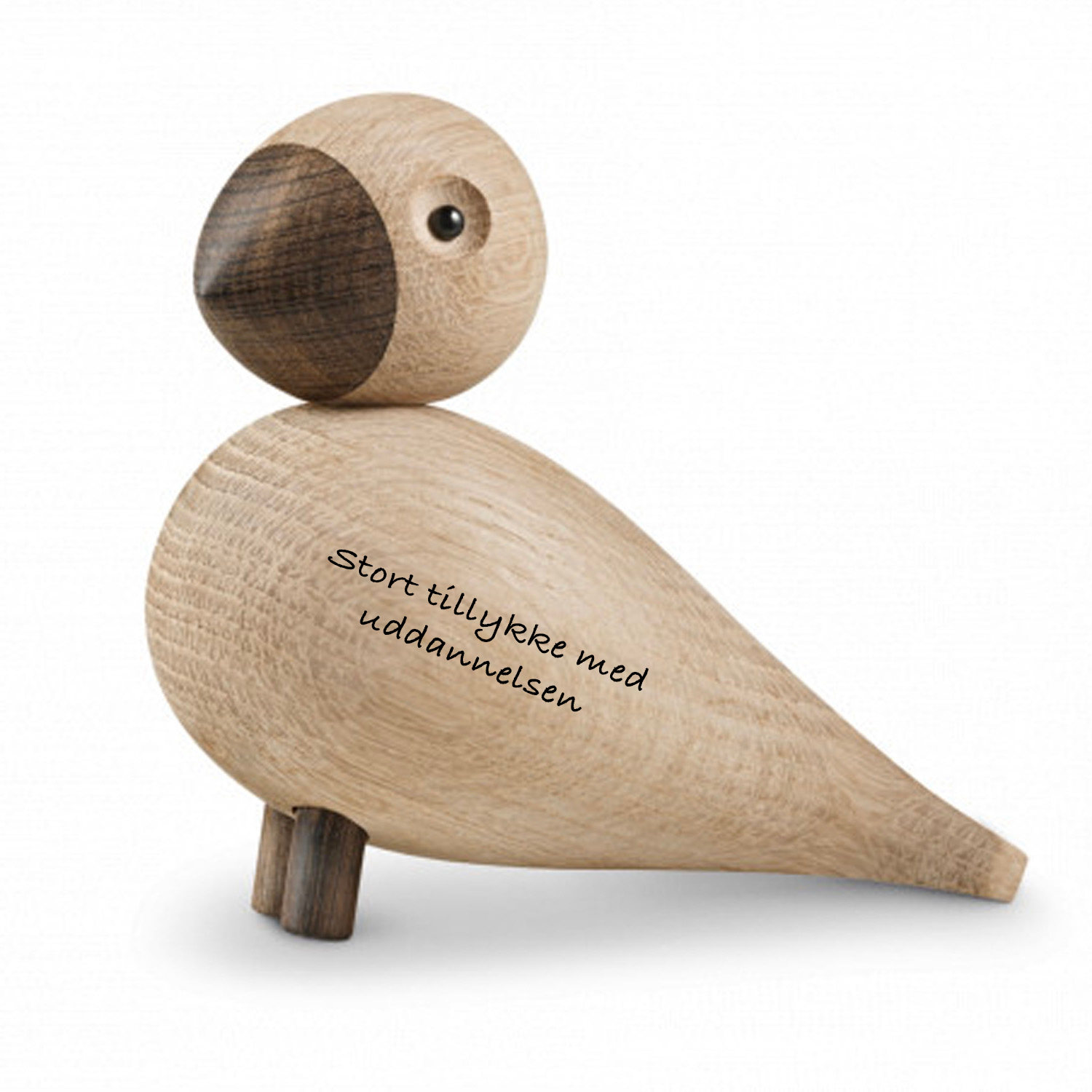 Sangfugl Alfred Eg / røget eg FSC®-CERTIFICERET Kay Bojesen Gratis gravering Kaj Boyesen sangfugl Alfred. Kay Bojesen fuglen Alfred er sidst ankomne familiemedlem i rækken af trædyr fra aber til flodheste og sangfugle.Alfred er skabt i natureg og røget e