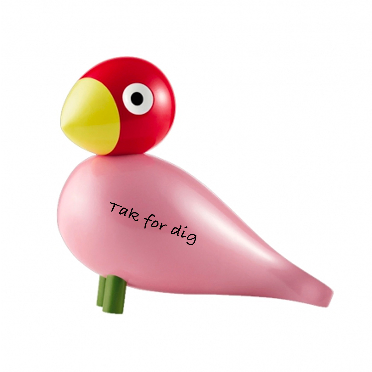 Sangfugl Ruth Lyserød fugl FSC®-CERTIFICERET Kay Bojesen Gratis gravering Sangfuglen Ruth fra Kay Bojesen. Ruth er en rigtig fin træ fugl som med de lyserøde farver, giver liv i det lille hjem Sangfuglen kan lasergraveres med din personlige tekst på si