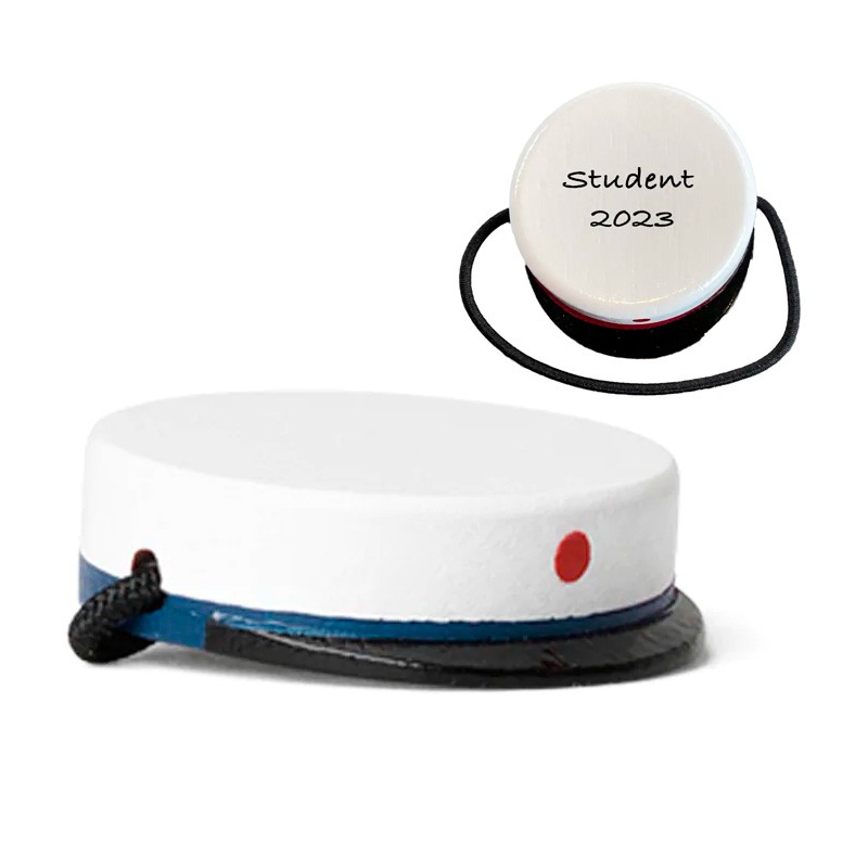 Blå hue Passer til mini aben FSC®-CERTIFICERET Kay Bojesen Design Gratis gravering Blå hue til Kay Bojesen figurer Studenterhue til Kay Bojesen figurer - blå bånd. En fin løs hue til at sidde på aben. Studenterhuen har elastik som bånd, dergør den nem a
