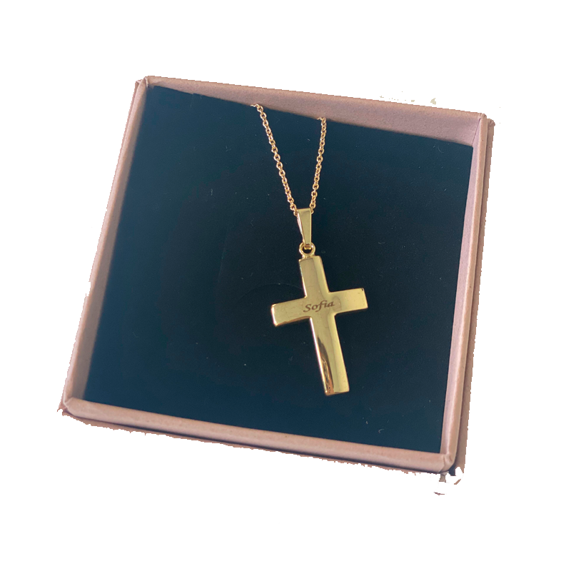 Flot 8 kt. guld kors med forgyldt kæde. Et smukt 8 kt. guld kors med mat bagside og blank forside og afrundede hjørner på forsiden Vigtigt vedrørende retur og reklamation Da produktet er færdiggraveret, kan det desværre ikke returneres. Varen er en 2. sor