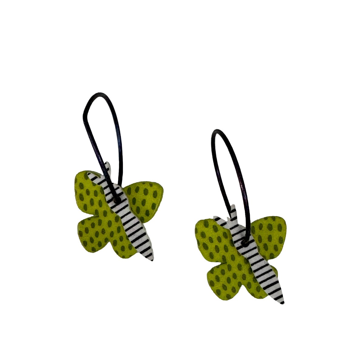 inurlige og legesyge øreringe fra det danske firma Lene Lundberg, kendt for deres kreative og farverige designs. Øreringene er fremstillet med en hypoallergen hoop i titanium, som gør dem behagelige at bære også for sarte ører kombineret med et fint og