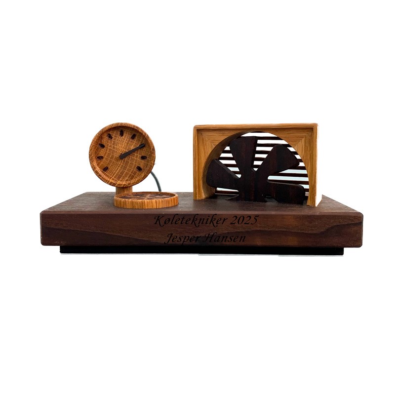 Design: Træstatuette med ventilator og måler. Størrelse: 9 x 18 cm. Gravering: Op til 30 tegn, 2 linjer. Placering: Gravering på siden eller under bunden. Gave: Leveres i en flot gaveæske. Køletekniker Statuette En hyldest til fagets finesse Køletekniker