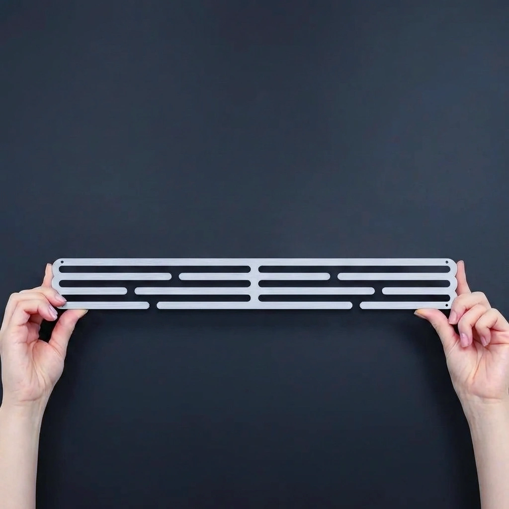 Minimalistisk medaljeophæng i børstet stål Dette stilrene medaljeophæng er designet til at fremvise dine medaljer på en enkel og elegant måde. Det minimalistiske design gør, at fokus forbliver på medaljerne og de præstationer, de repræsenterer. Ophænget e
