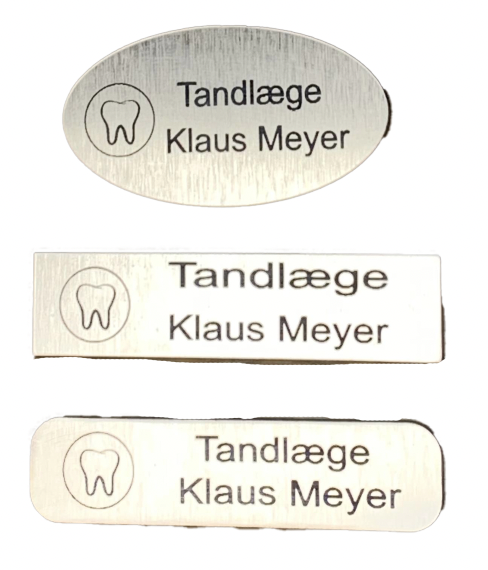 Aflangt plastik Med nål eller magnet 3 forskellige former Med mulighed for motiv Gratis gravering Navneskilt til tøj med nål Et stilrent navneskilt med en tegning i siden, perfekt til personlig brug eller som gave. Skiltet måler 80 x 20 mm og leveres med