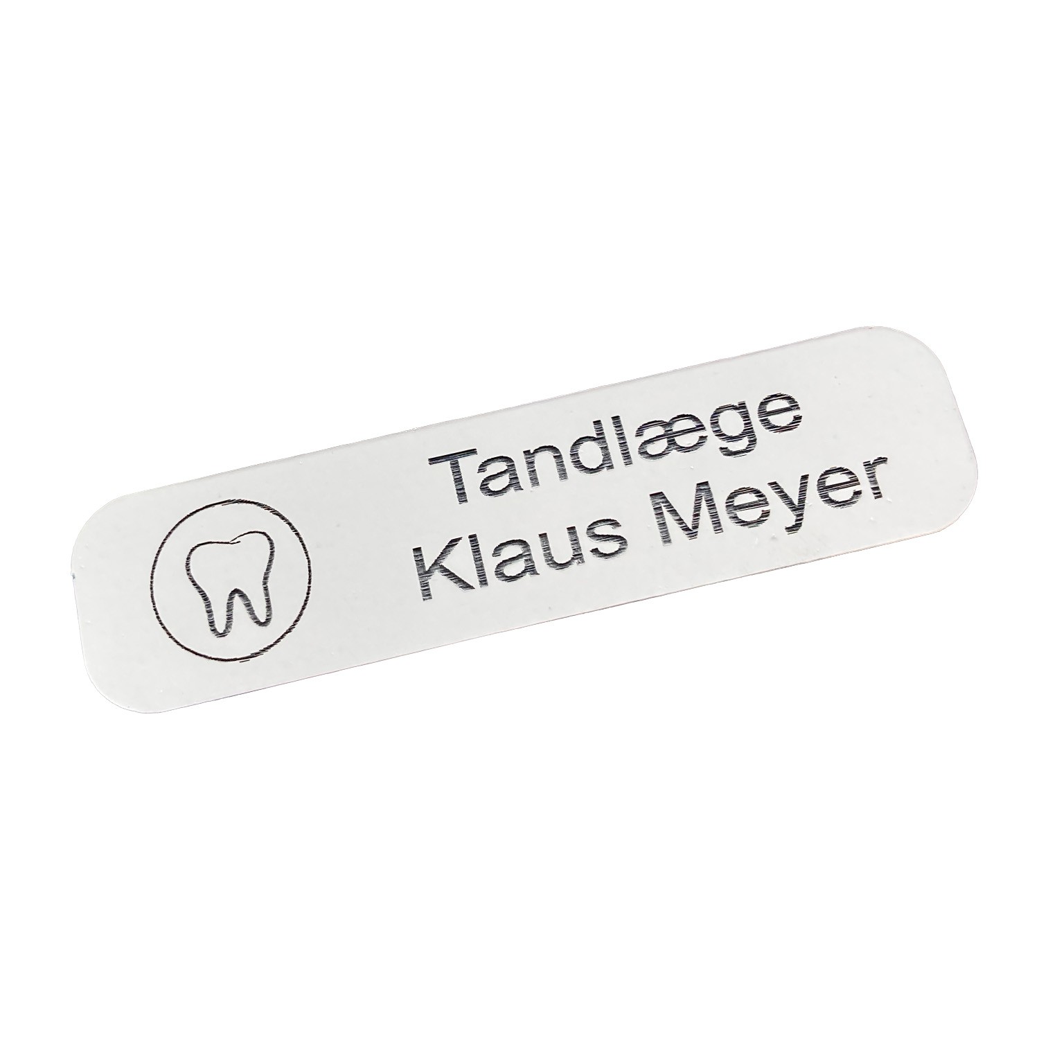 Aflangt plastik Med nål 8 x 2 cm Med tandlæge logo Gratis gravering Navneskilt til tøj med nål Enkelt og stilrent navneskilt med tandtegning i siden. Skiltet måler 80 x 20 mm og leveres med nål på bagsiden, så det nemt kan fastgøres på tøjet. Her kan du