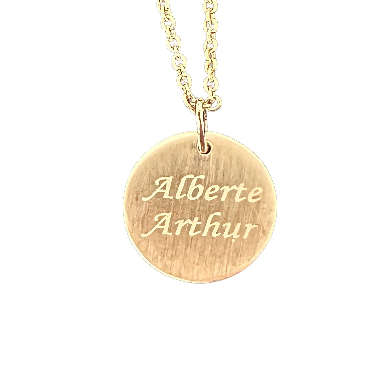 Rundt vedhæng 8 kt ( FÆRDIG GRAVERET - Alberte / Arthur )